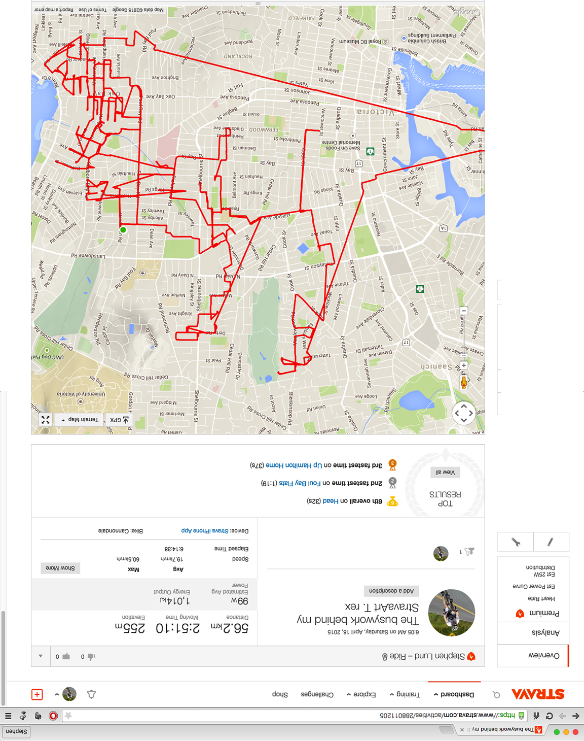 To create 40 kilometres of prehistoric Strava art, Strava doodler Stephen Lund actually had to cycle nearly 100 km. Pictured here is an iPhone Strava app recording of all the mileage that isn’t “captured” in the other image.