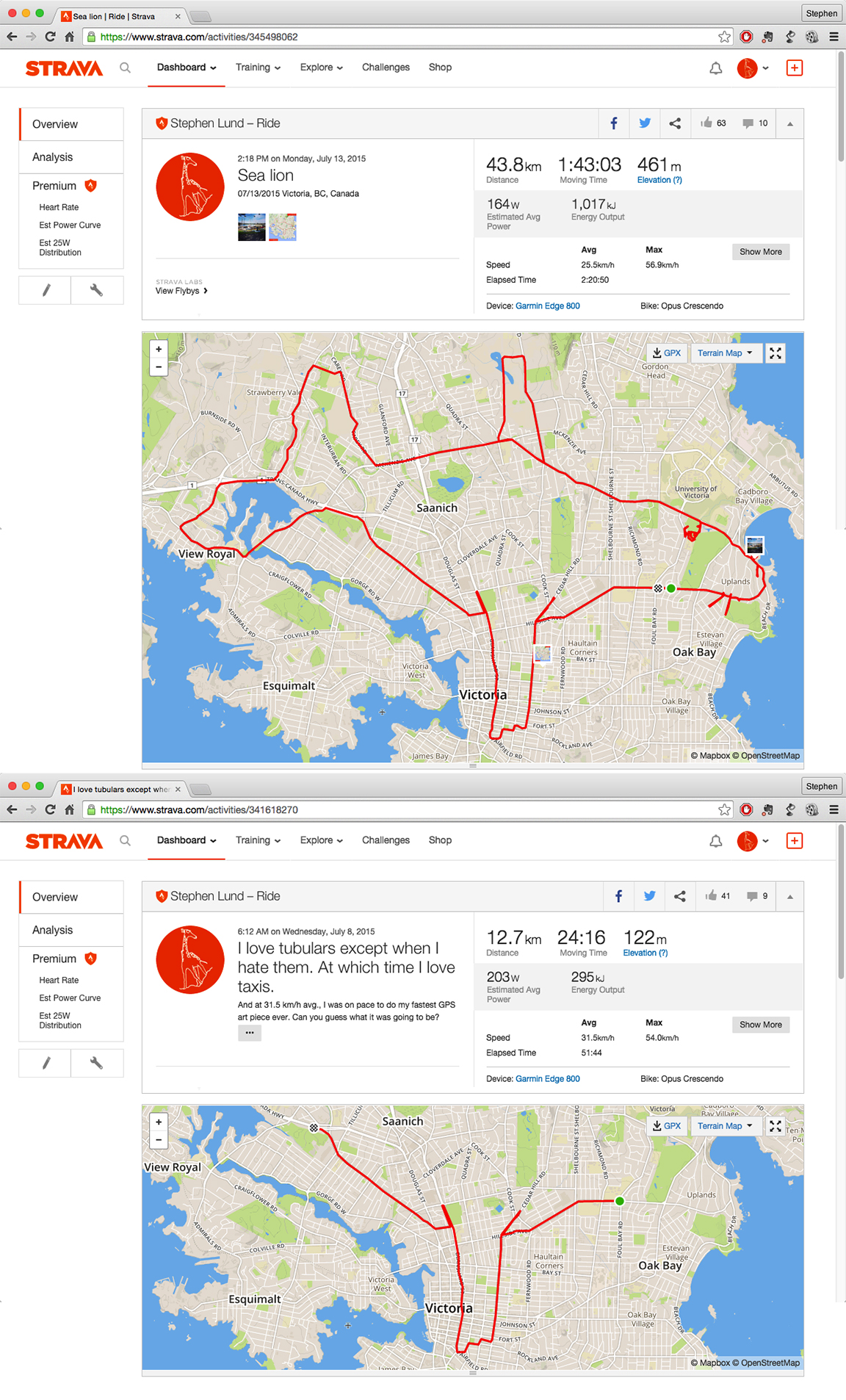 It’s the type of GPS doodle I like best, where 100% of the picture follows the streets of the city and my ride follows one continuous line from start to finish. (That said, I did have to stop/start my Garmin twice and make a few kilometres worth of detours along the way – once to safely cross the highway to Wilkinson Road at the bottom of the tail, and again at the tip of the left flipper to get around a big fence between GardenWorks and the Galloping Goose.)