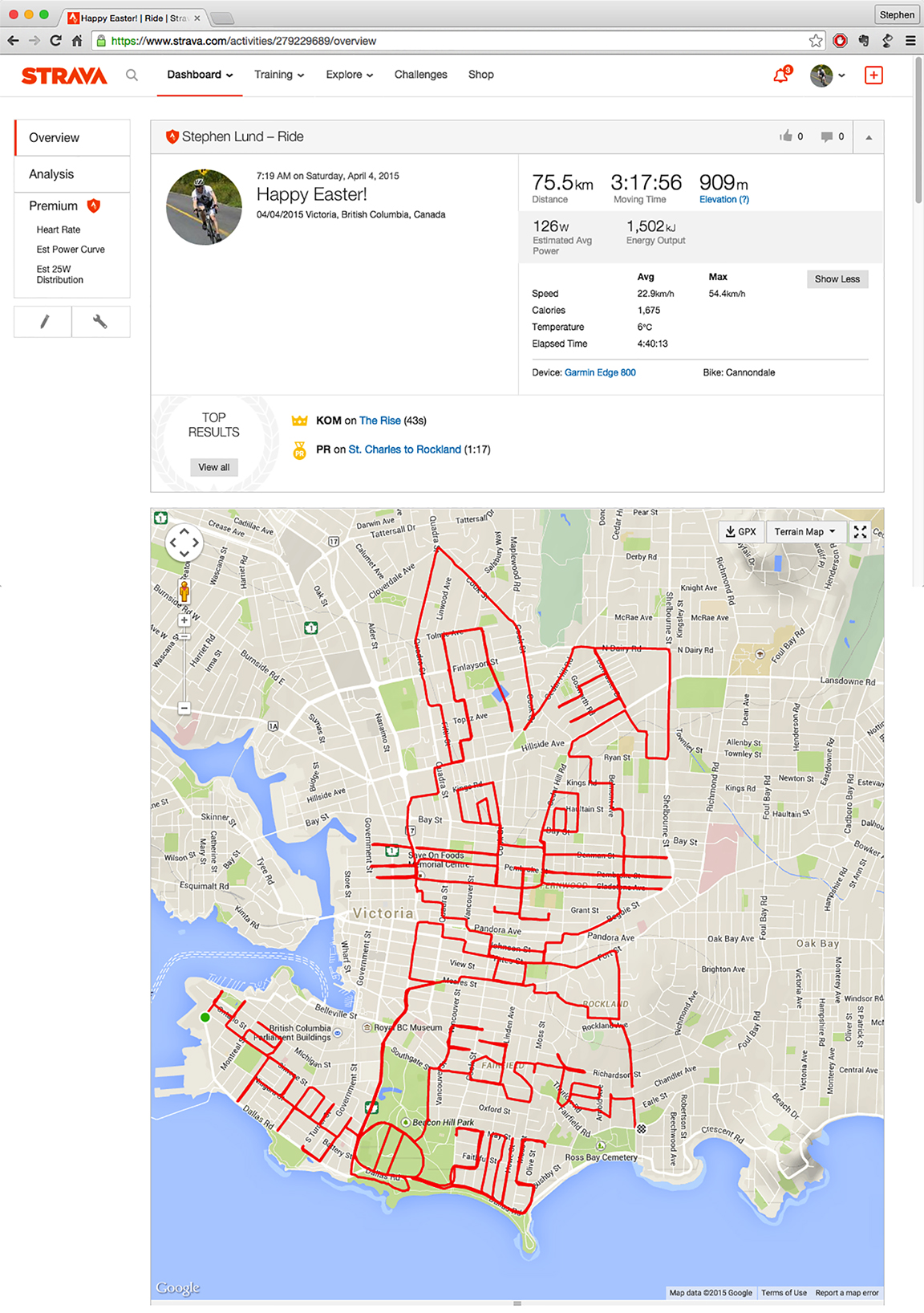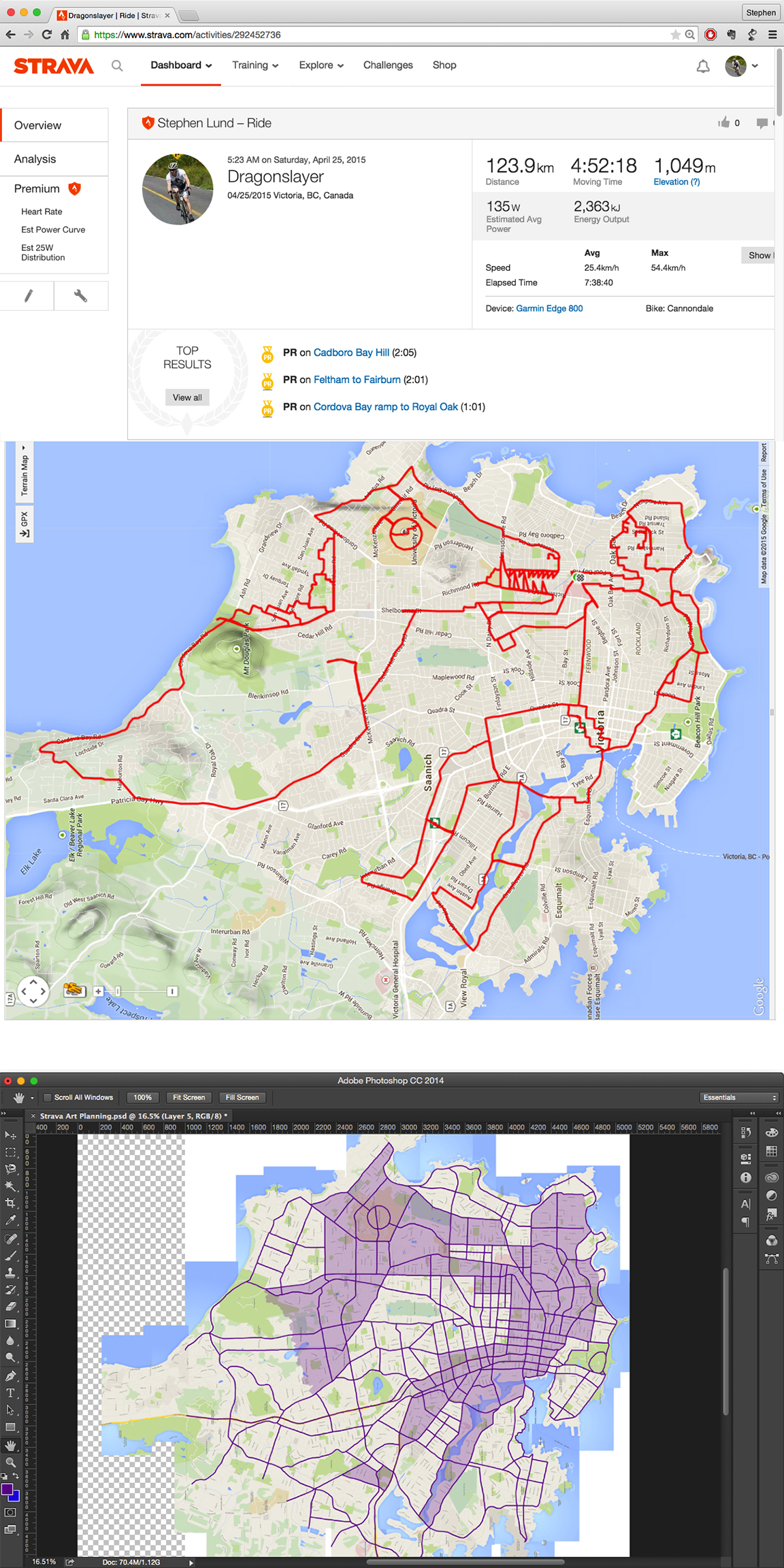 The broad strokes of this StravaArt scene – created with 125 km worth of pedalling around Victoria – were clearly visible within the map after I highlighted the city’s main roads